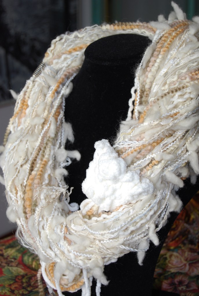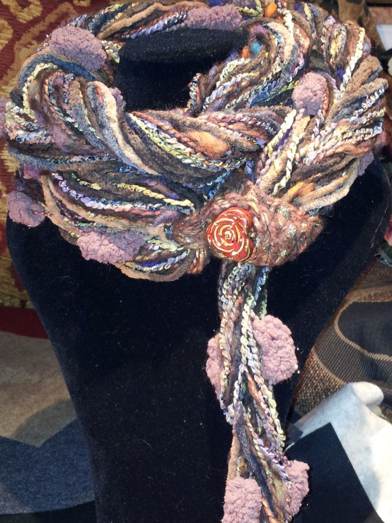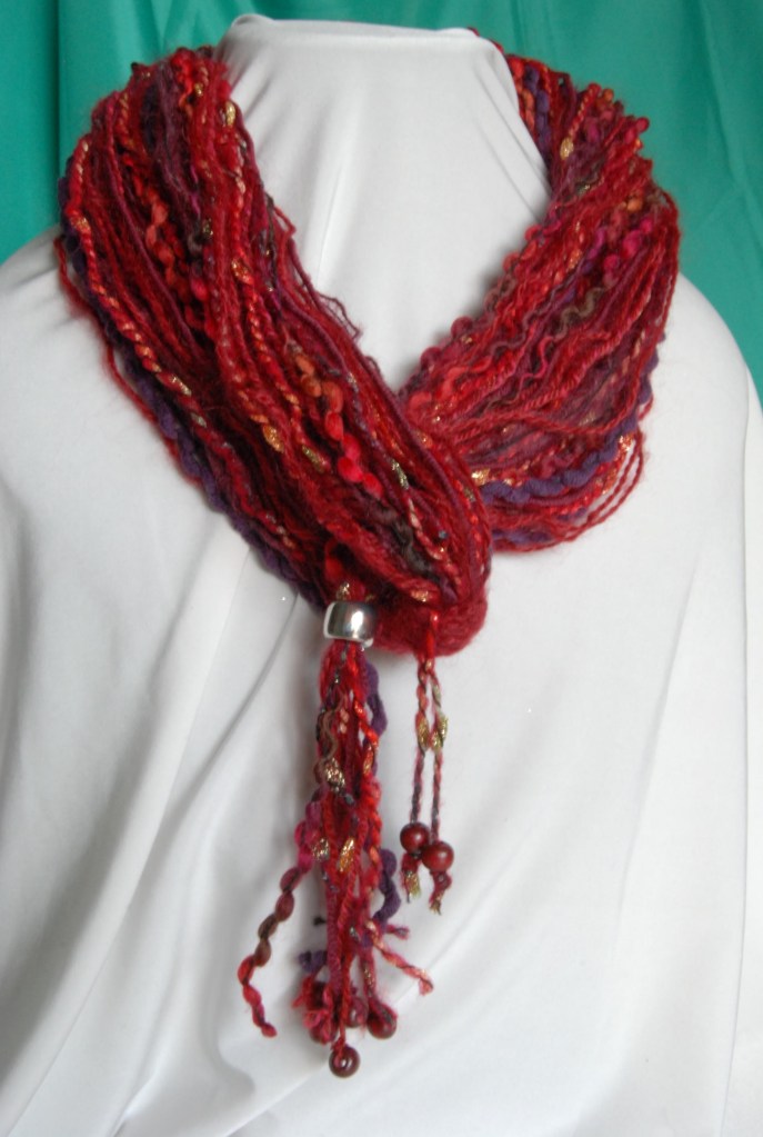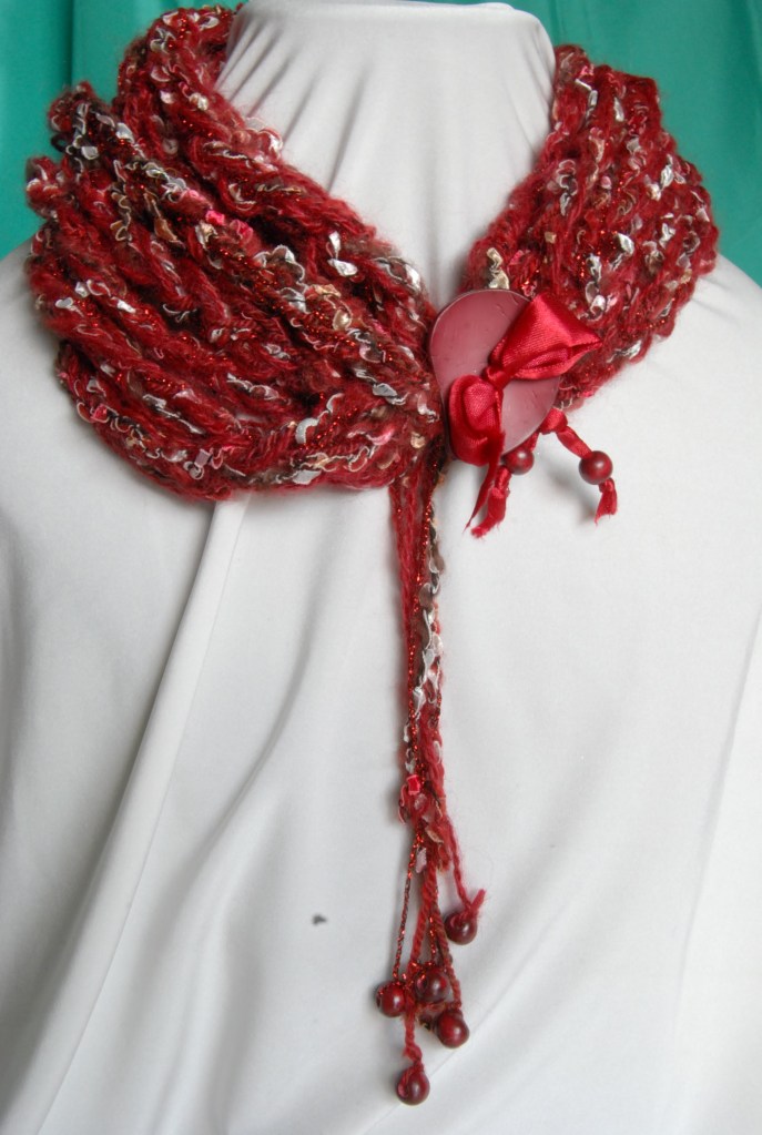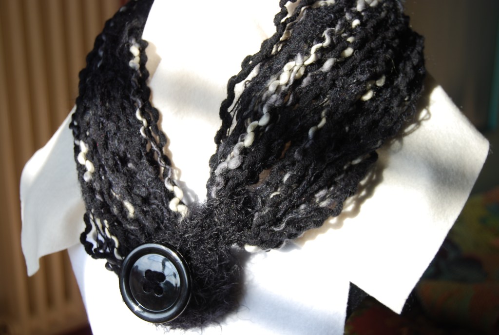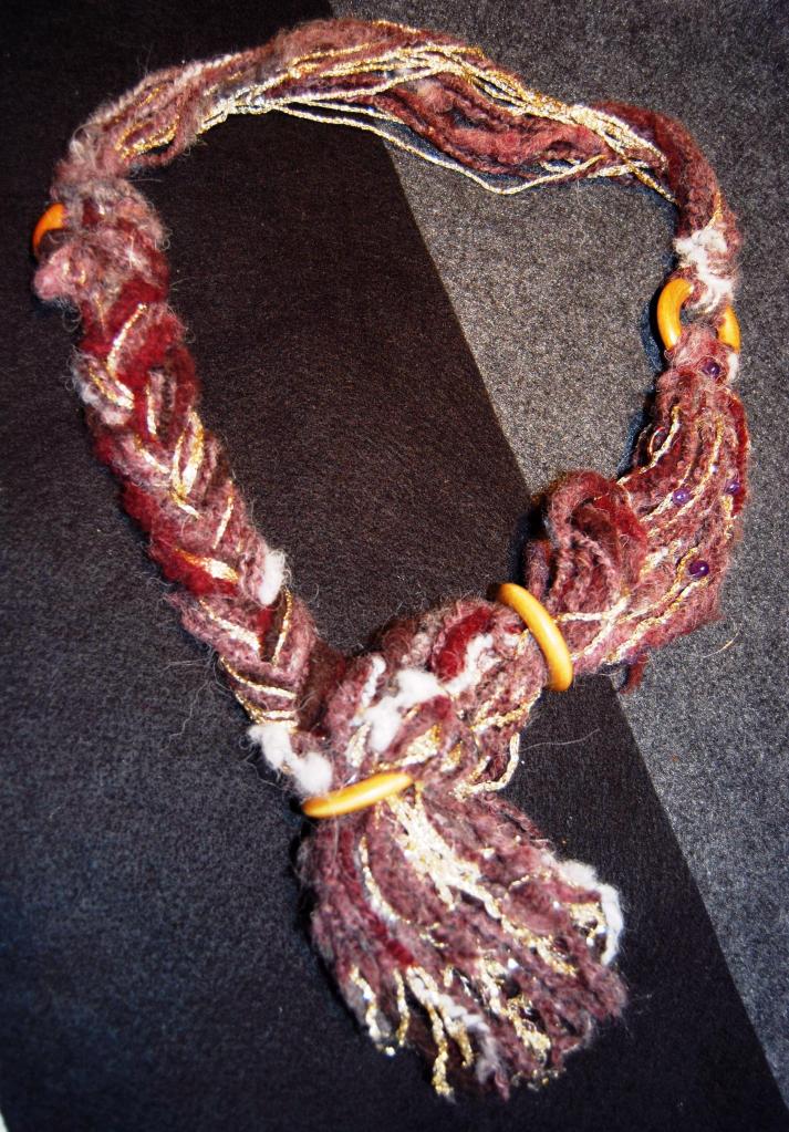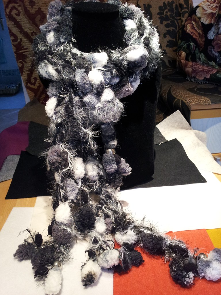 Sciarpa CAMELIA: vari filati lana Mondial e Filatura di Crosa stretti da nastri in raso e velluto. Lunghezza cm 220.Sciarpa CAREY: vari filati Mondial lavorati a uncinetto in tre grossi cordoni finiti con anelli in metallo. Lunghezza cm 127.Sciarpa CLELIA: vari filati in lana Mondial e Filatura di Crosa. Rifinita all’estremità con lavorazione all’uncinetto su cui è fissato un grosso bottone in ceramica.Sciarpa COSTANZA: scaldacollo vari filati in lana Mondial e Filatura di Crosa. Chiusura in legno.Sciarpa CRYSTAL: scaldacollo in lana formata da un unico gomitolo di lana stesa e lavorata in modo da creare due estremi rifiniti ad uncinetto. Chiusura in ceramica. Lunghezza cm 75.Sciarpa CORA: Scaldacollo formato da un unico gomitolo steso finito alle estremità ad uncinetto Chiusura con grosso bottone in resina. Lunghezza cm 75.Sciarpa CAROLA: Scaldacollo in filato di lana lavorata in un unico cordone ad uncinetto. Chiusura con grosso bottone in resina. Perle in legno rifiniscono la coda sul davanti. Lunghezza cm 74.Sciarpa CARRIE: Scaldacollo in vari filati di lana Mondial e Filatura di Crosa. Chiusura con grosso bottone rivestito in velluto. Perle in legno rifiniscono la coda davanti. Lunghezza cm 106.Sciarpa CASSANDRA: Scaldacollo vari filati in lana Mondial e Filatura di Crosa. Finita con perle in legno, anello in metallo. Lunghezza cm 90.Sciarpa CLARISSE: in vari filati in lana Mondial e Filatura di Crosa, lavorati a treccia chiusi con nastri e perle in legno. Lunghezza cm 200.Sciarpa CORINNE: in lana Merinos, nastri e filato in lamé. Chiusura con grosso anello ellittico passante in osso naturale. All’estremità rifinita con cilindri e perle in legno. Lunghezza cm 175.Sciarpa CELINE: in lana Mondial e ciniglia, nastri in velluto e finali in metallo. Lunghezza cm 170.Sciarpa CHLOE: Lunga sciarpa in vari filati in lana lavorati in un unico cordone ad uncinetto fissato a telaio, inserti ad anello in metallo. Lunghezza cm 360.Sciarpa CHARLINE: Scaldacollo in lana realizzata con un unico cordone lavorato ad uncinetto fissato da nastro in raso. Filatura di Crosa. Lunghezza cm 180Sciarpa CLELIA: in lana lavorata in un’unica treccia. Chiusura con passanti in osso naturale. Lunghezza cm 180.Sciarpa CINDY: vari filati in lana Mondial, nastri e perle in vetro sfaccettato. Lunghezza cm 270.Sciarpa CECILIA: vari filati in lana Mondial, rifinita con nastri in raso e perle in vetro sfaccettato.Sciarpa CLORETTE: vari filati in lana e ciniglia, tessuti da nastri finiti da perle e cilindri in legno. Lunghezza cm 320.Sciarpa CHRISTELLE: vari filati in lana lavorati in un unico cordone ad uncinetto, fissato a telaio. Nastri e un grosso bottone in raso permettono di chiuderla. Perle di legno rifiniscono la coda. Lunghezza cm 170.Sciarpa CLAUDINE: vari filati in lana Mondial e Filatura di Crosa e lurex. Lunghezza cm 170.Sciarpa CINZIA: vari filati in lana Mondial e Filatura di Crosa, inserti in metalloCollana SWAMI: in lana, ciondolo in pietraCollana MIREA: in lana. Chiusura in legno e ceramicaCollana MICOL: in lana. Ciondolo in pietraCollana MIRIAM: in lana. Inserti in bronzoCollana SOFIA: in vari filati in lana con anelli in legno