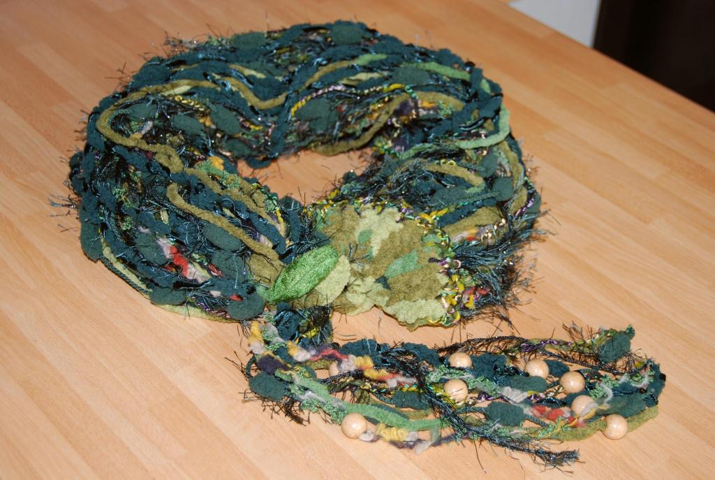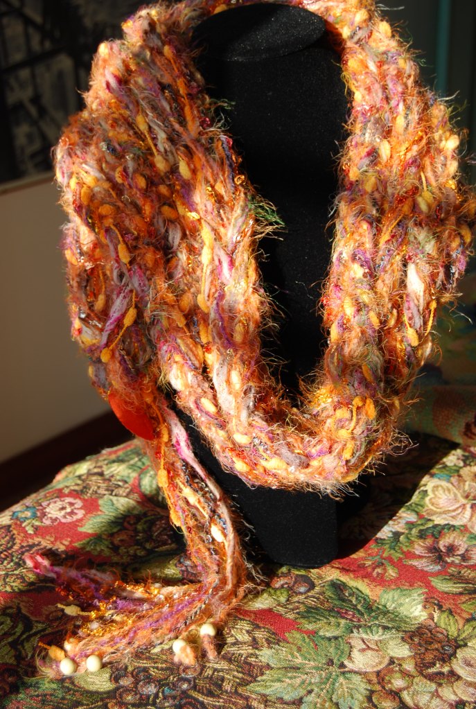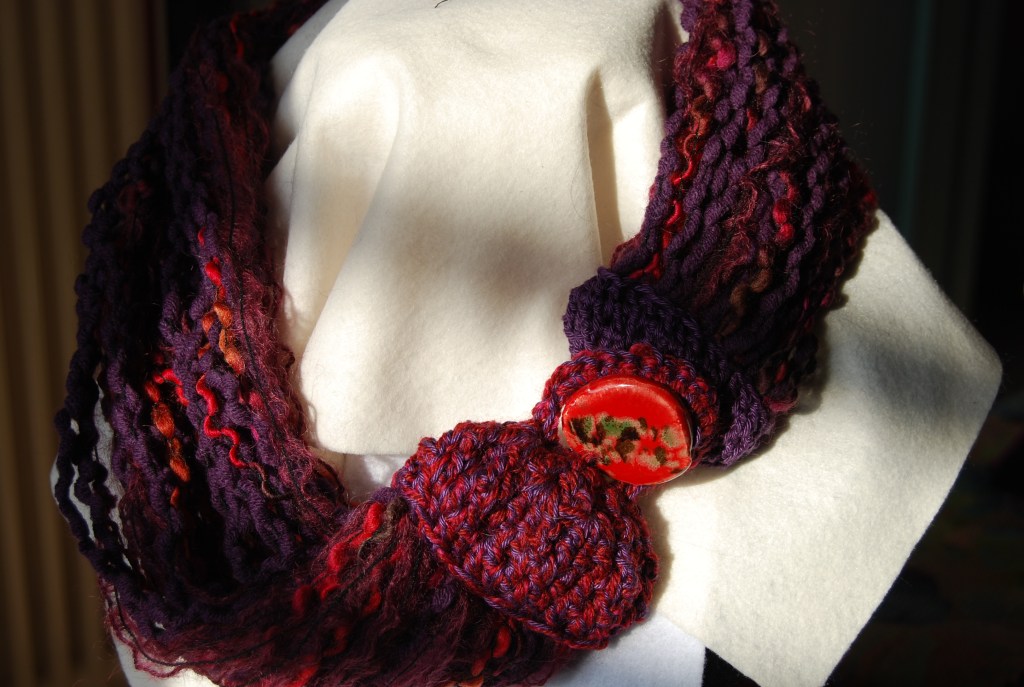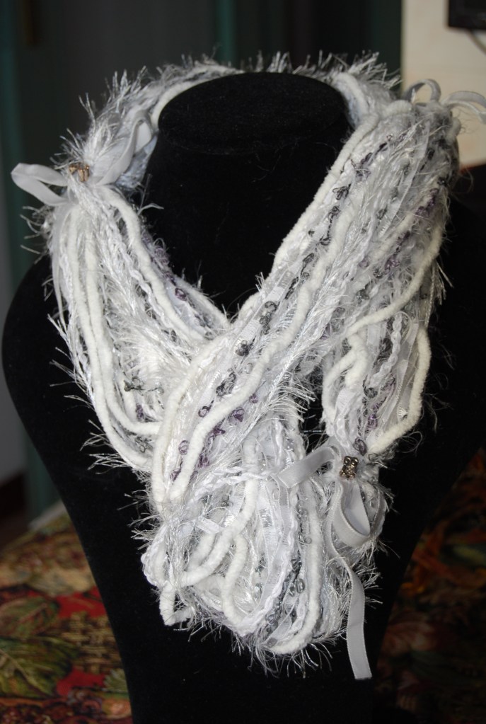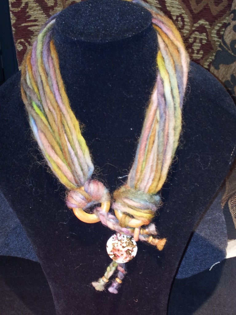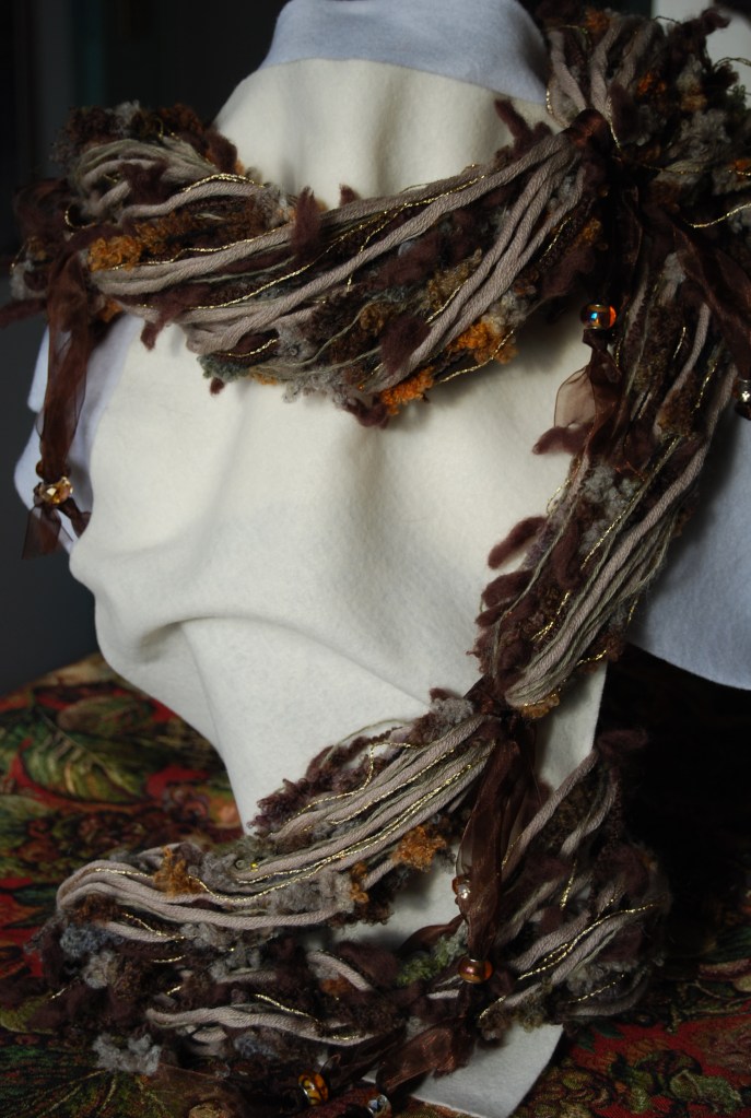Sciarpa CAMELIA: vari filati lana Mondial e Filatura di Crosa stretti da nastri in raso e velluto. Lunghezza cm 220.Sciarpa CAREY: vari filati Mondial lavorati a uncinetto in tre grossi cordoni finiti con anelli in metallo. Lunghezza cm 127.Sciarpa CLELIA: vari filati in lana Mondial e Filatura di Crosa. Rifinita all’estremità con lavorazione all’uncinetto su cui è fissato un grosso bottone in ceramica.Sciarpa COSTANZA: scaldacollo vari filati in lana Mondial e Filatura di Crosa. Chiusura in legno.Sciarpa CRYSTAL: scaldacollo in lana formata da un unico gomitolo di lana stesa e lavorata in modo da creare due estremi rifiniti ad uncinetto. Chiusura in ceramica. Lunghezza cm 75.Sciarpa CORA: Scaldacollo formato da un unico gomitolo steso finito alle estremità ad uncinetto Chiusura con grosso bottone in resina. Lunghezza cm 75.Sciarpa CAROLA: Scaldacollo in filato di lana lavorata in un unico cordone ad uncinetto. Chiusura con grosso bottone in resina. Perle in legno rifiniscono la coda sul davanti. Lunghezza cm 74.Sciarpa CARRIE: Scaldacollo in vari filati di lana Mondial e Filatura di Crosa. Chiusura con grosso bottone rivestito in velluto. Perle in legno rifiniscono la coda davanti. Lunghezza cm 106.Sciarpa CASSANDRA: Scaldacollo vari filati in lana Mondial e Filatura di Crosa. Finita con perle in legno, anello in metallo. Lunghezza cm 90.Sciarpa CLARISSE: in vari filati in lana Mondial e Filatura di Crosa, lavorati a treccia chiusi con nastri e perle in legno. Lunghezza cm 200.Sciarpa CORINNE: in lana Merinos, nastri e filato in lamé. Chiusura con grosso anello ellittico passante in osso naturale. All’estremità rifinita con cilindri e perle in legno. Lunghezza cm 175.Sciarpa CELINE: in lana Mondial e ciniglia, nastri in velluto e finali in metallo. Lunghezza cm 170.Sciarpa CHLOE: Lunga sciarpa in vari filati in lana lavorati in un unico cordone ad uncinetto fissato a telaio, inserti ad anello in metallo. Lunghezza cm 360.Sciarpa CHARLINE: Scaldacollo in lana realizzata con un unico cordone lavorato ad uncinetto fissato da nastro in raso. Filatura di Crosa. Lunghezza cm 180Sciarpa CLELIA: in lana lavorata in un’unica treccia. Chiusura con passanti in osso naturale. Lunghezza cm 180.Sciarpa CINDY: vari filati in lana Mondial, nastri e perle in vetro sfaccettato. Lunghezza cm 270.Sciarpa CECILIA: vari filati in lana Mondial, rifinita con nastri in raso e perle in vetro sfaccettato.Sciarpa CLORETTE: vari filati in lana e ciniglia, tessuti da nastri finiti da perle e cilindri in legno. Lunghezza cm 320.Sciarpa CHRISTELLE: vari filati in lana lavorati in un unico cordone ad uncinetto, fissato a telaio. Nastri e un grosso bottone in raso permettono di chiuderla. Perle di legno rifiniscono la coda. Lunghezza cm 170.Sciarpa CLAUDINE: vari filati in lana Mondial e Filatura di Crosa e lurex. Lunghezza cm 170.Sciarpa CINZIA: vari filati in lana Mondial e Filatura di Crosa, inserti in metalloCollana SWAMI: in lana, ciondolo in pietraCollana MIREA: in lana. Chiusura in legno e ceramicaCollana MICOL: in lana. Ciondolo in pietraCollana MIRIAM: in lana. Inserti in bronzoCollana SOFIA: in vari filati in lana con anelli in legno